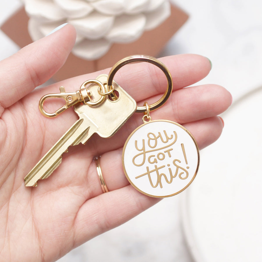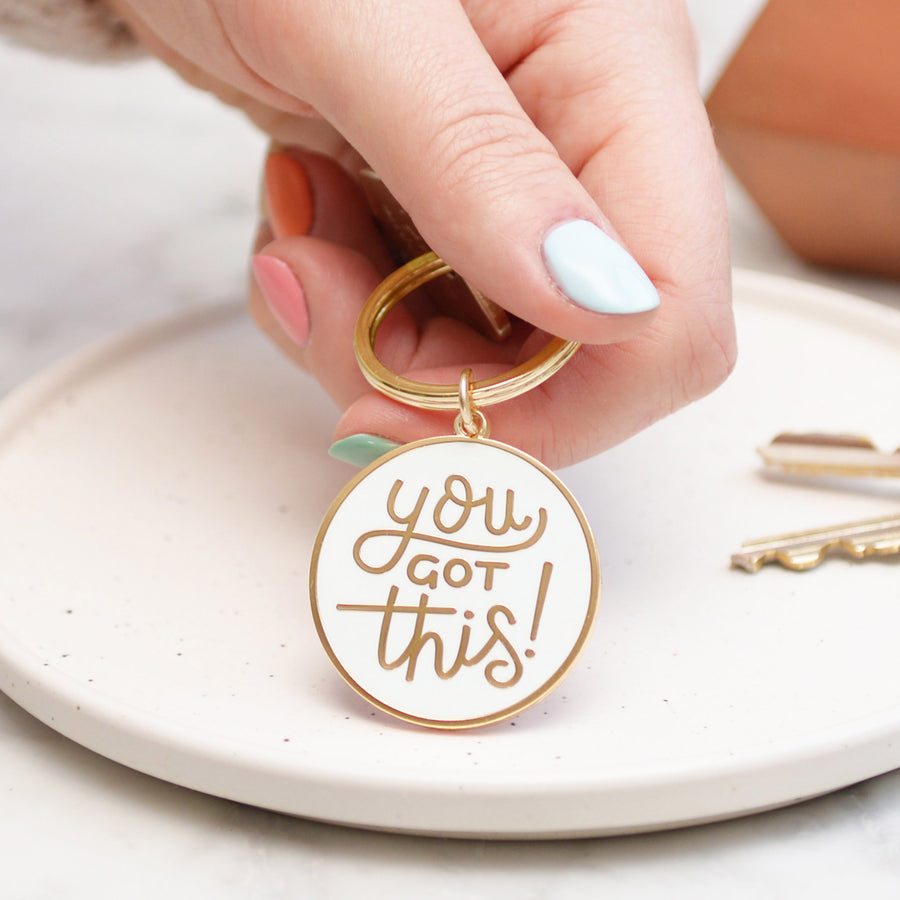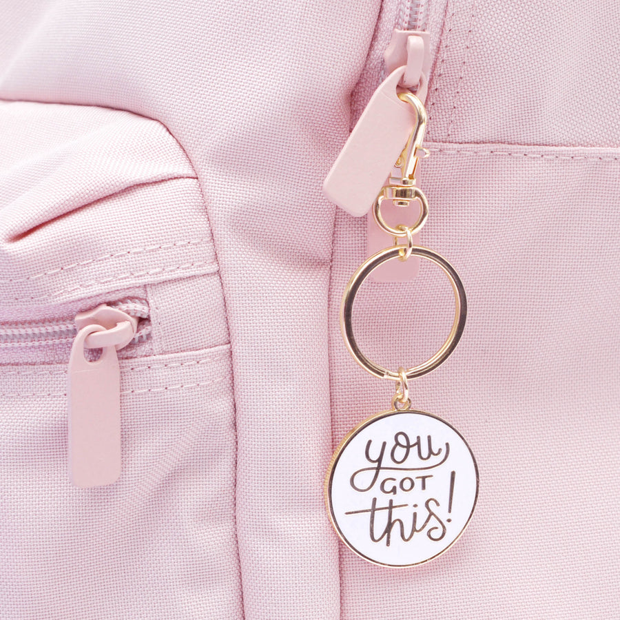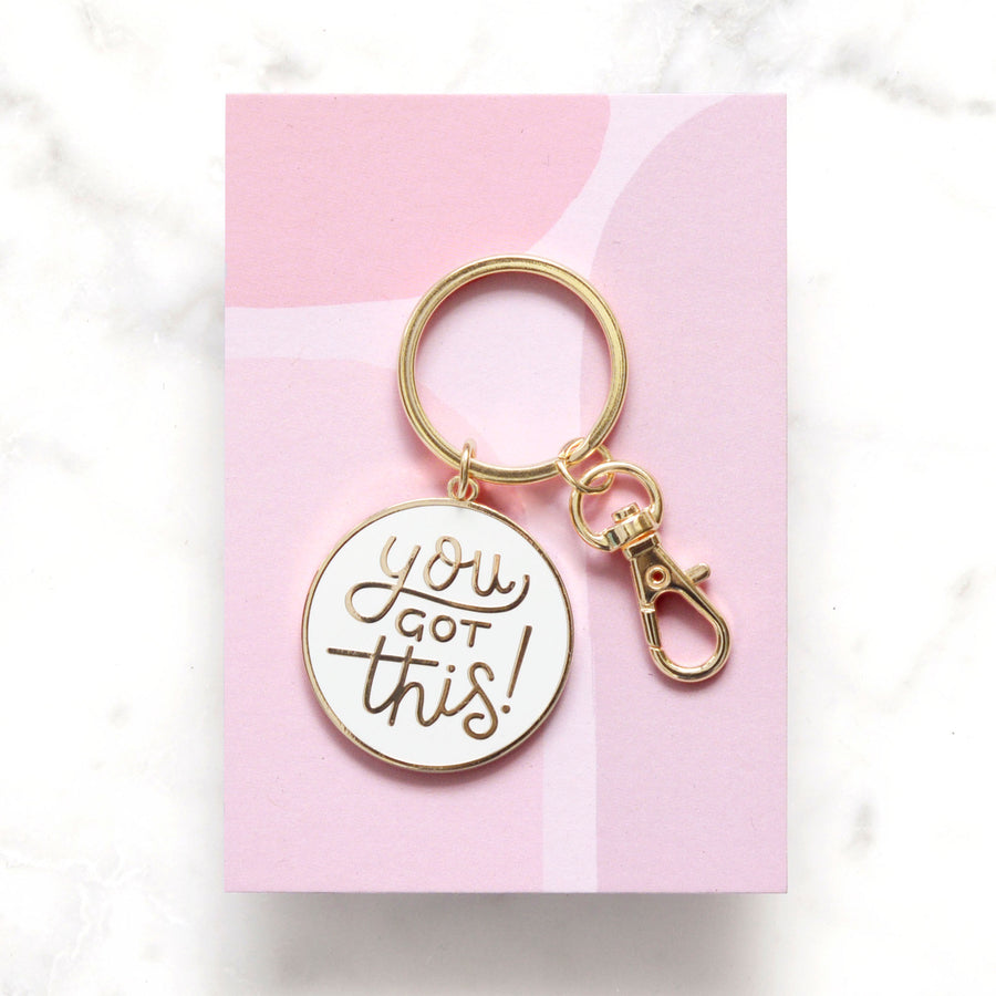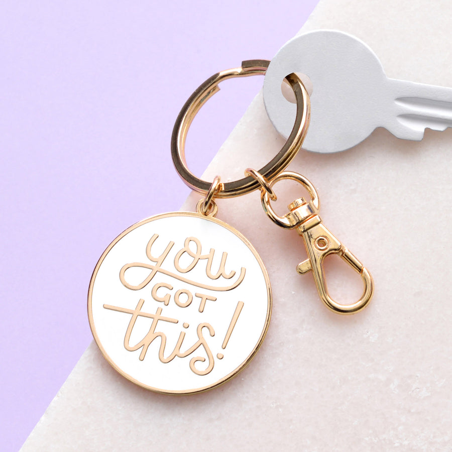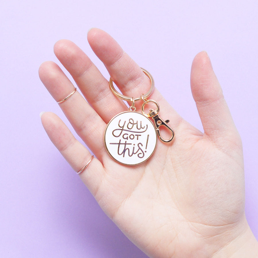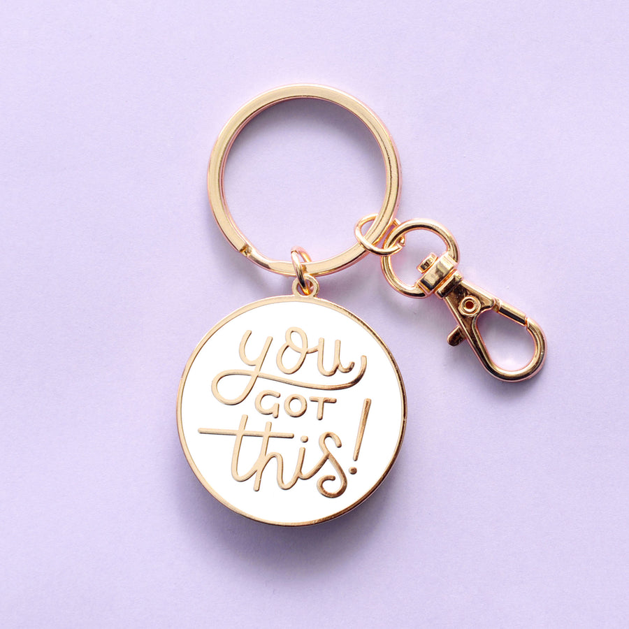 A lovely shiny keychain, featuring our hand drawn 'You Got This' design. Made from white hard enamel and gold toned metal. Complete with keyring and an extra clip, perfect for attaching to your keys, backpacks or whatever you fancy adding some charm to!